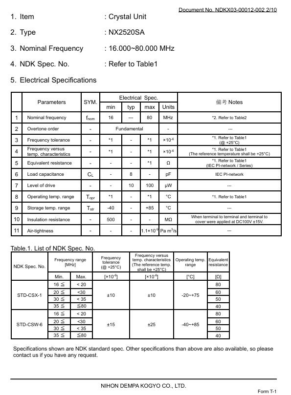 | 晶振規格參數 | NX2520SA-32MHZ-STD-CSW-2無源晶振 |