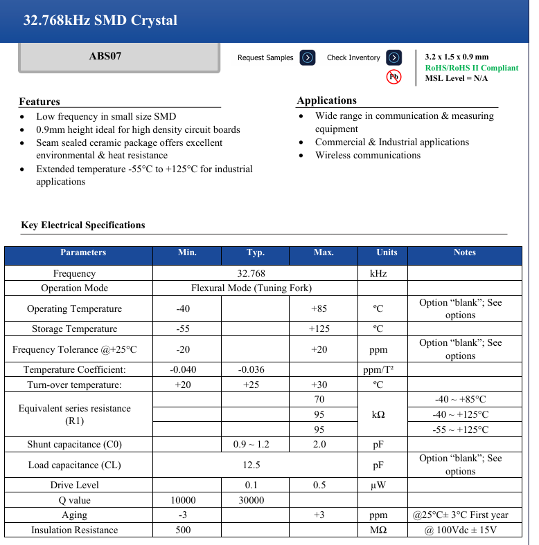 當無線通信設備精準傳遞信號,當工業測量儀器穩定輸出數據,我們往往聚焦于終端設備的強大功能,卻忽略了藏于電路板深處的“時間基準”——ABS07-32.768KHZ-T晶振.美國艾博康Abracon晶振進口的3215型32.768KHZ石英晶體,以3215封裝尺寸、12.5PF負載電容、20PPM頻率偏差的精準參數,在方寸之間彰顯技術硬核,成為現代電子產業的關鍵基石.