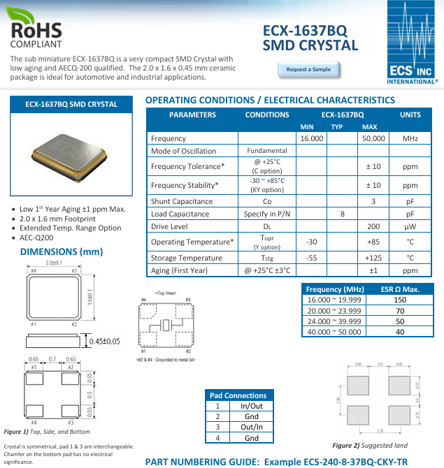更多>>ECS-250-10-37BQ-CTN-TR伊西斯ECS晶振2016 25M