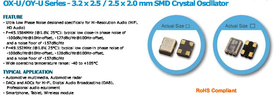 在各種不斷增加的高音質(zhì)需求的數(shù)字音頻系統(tǒng),如智能電話,汽車音響,和可攜式音響系統(tǒng)中,需要為不斷增加的小型化和高性能的時(shí)鐘解決方案,也促使符合成本效益的系統(tǒng)設(shè)計(jì)也在增長.泰藝晶振的OX-U和OY-U系列是專門優(yōu)化,以解決Hi-Fi音響應(yīng)用的需求.