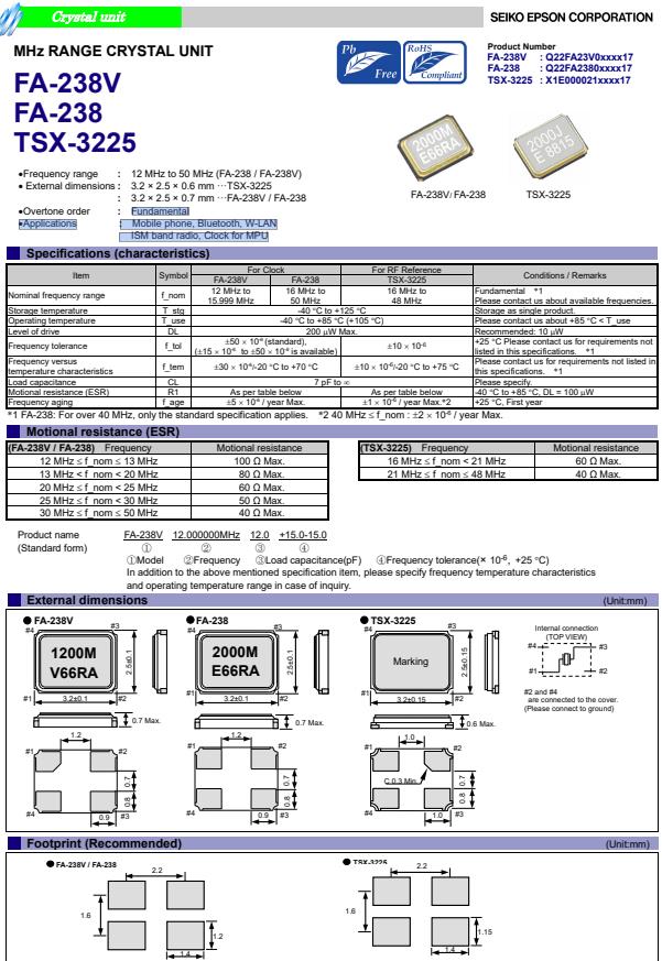 | Q22FA23V0045216 | 3.2 x 2.5 x 0.7mm | FA-238V | 12.000000 MHz | 7 pF | +/-50 ppm | +/-30 ppm | -20 to +70 °C |